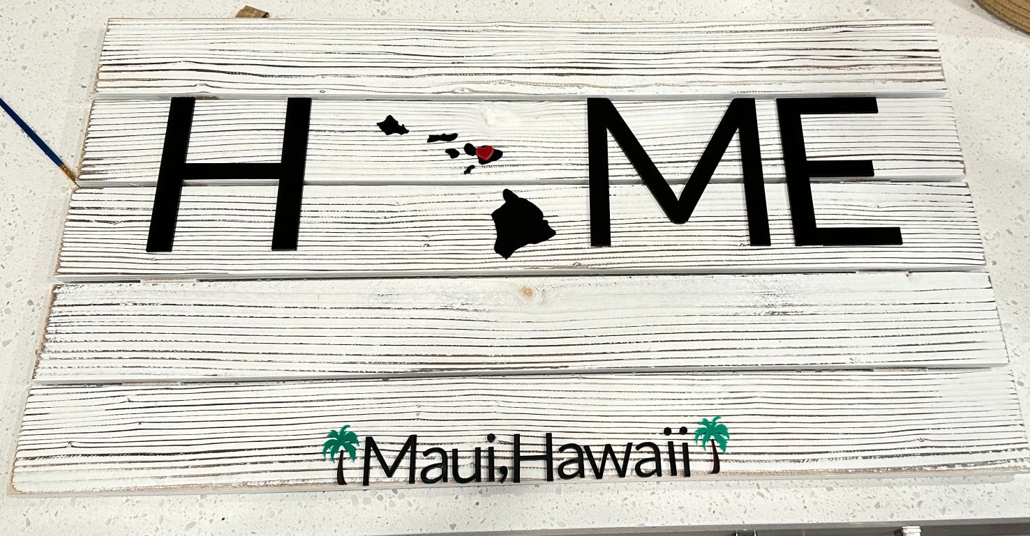 This customizable "Home" sign is a charming and personalized piece of decor, perfect for showcasing your pride in your state and city. The sign features a rustic design with distressed white wooden panels and bold black lettering. The word "HOME" is prominently displayed horizontally, with the "O" cleverly replaced by an outline of your chosen state, including a small red heart marking your specific city. Additionally, the name of the state and city, such as "Maui, Hawaii," is written horizontally at the bottom left corner, accompanied by a green palm tree icon, adding a touch of tropical flair.