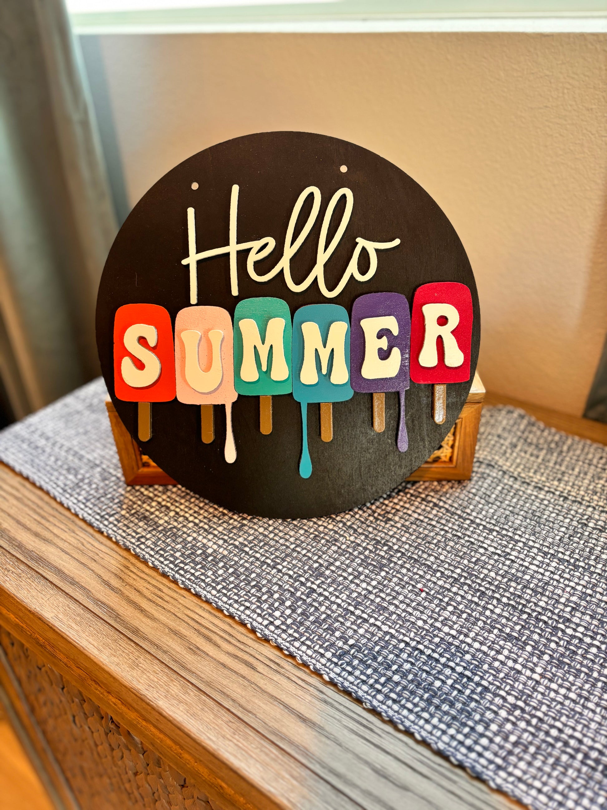 Celebrate the sunny season with our vibrant "Hello Summer" Popsicle Wall Art. This delightful piece features colorful, dripping popsicles spelling out "SUMMER" beneath a cheerful "Hello" greeting, perfectly capturing the fun and joy of summertime. Handcrafted with meticulous attention to detail, each element is carefully cut and painted to create a lively, eye-catching display. Perfect for adding a splash of color and a playful touch to your home decor, this sign is ideal for brightening up your kitchen, patio, or any space in need of a summery vibe. Welcome the season with a smile and enjoy the playful charm of our "Hello Summer" Popsicle Wall Art.