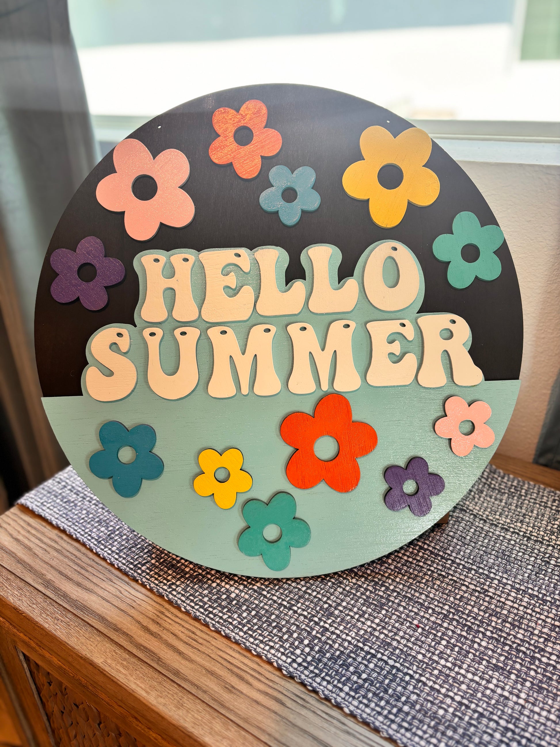 Welcome the sunny season with our charming "Hello Summer" Wooden Sign! Crafted with care, this decorative piece is perfect for adding a splash of color to your home or garden. The sign features a smooth, circular wooden base painted in a refreshing summer palette. Adorned with vibrant, cut-out flowers and playful, retro-style text, this sign exudes a cheerful and welcoming vibe.