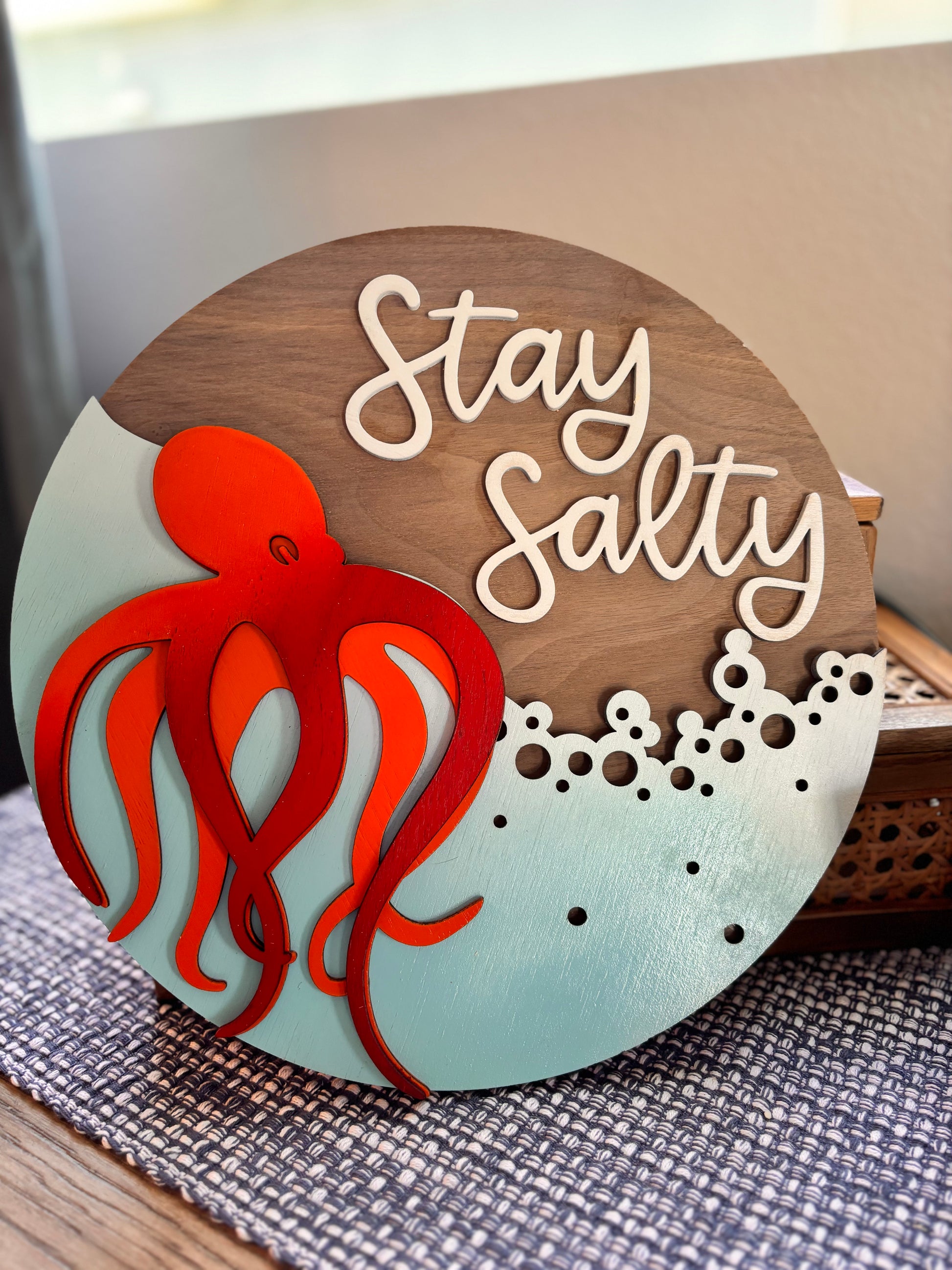 Add a splash of seaside charm to your home with our handcrafted "Stay Salty" Coastal Wall Art. This unique piece features a vibrant octopus and playful waves, expertly cut and painted to bring a touch of the ocean to any room. Perfect for beach lovers and coastal decor enthusiasts, this wall art is a delightful reminder to embrace the salty spirit of the sea. Whether you're decorating your beach house or bringing a coastal vibe to your everyday space, our "Stay Salty" sign is sure to make a splash. Made with high-quality materials and attention to detail, each piece is a work of art that adds personality and charm to your decor.